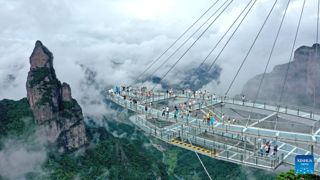 BEIJING, 17 septiembre, 2024 (Xinhua) -- Vista aérea tomada con un dron del 17 de septiembre de 2024 de turistas visitando el punto escénico de Shenxianju, en Taizhou, en la provincia de Zhejiang, en el este de China. Los chinos disfrutaron de tres días de vacaciones por el Festival de Medio Otoño, que este año cayó el 17 de septiembre. (Xinhua/Wang Huabin)