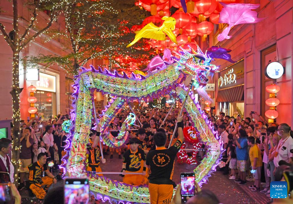 HONG KONG, 17 septiembre, 2024 (Xinhua) -- Personas observan una danza del dragón durante el Festival de Medio Otoño, en Hong Kong, en el sur de China, el 17 de septiembre de 2024. (Xinhua/Chen Duo)