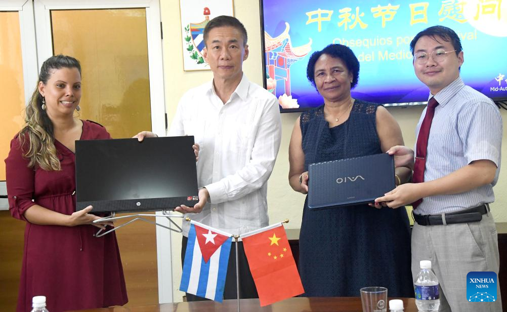 El embajador de China en Cuba, Hua Xin (2-i), y la rectora de la Universidad de La Habana, Miriam Nicado (2-d), muestran una donación de medios electrónicos de parte de la Embajada china en el marco de la celebración del Festival de Medio Otoño, en el Barrio Chino, en La Habana, capital de Cuba, el 17 de septiembre de 2024. Alumnos y profesores del Instituto Confucio de La Habana celebraron el martes el Festival de Medio Otoño con un homenaje a la cultura china, que incluyó una exposición de diferentes artes y una vistosa ceremonia del té. (Xinhua/Joaquín Hernández)