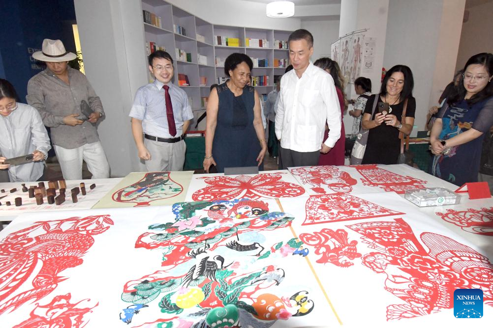 El embajador de China en Cuba, Hua Xin (3-d), y la rectora de la Universidad de La Habana, Miriam Nicado (c), observan una muestra de bordado chino en un salón del Instituto Confucio de La Habana en el marco de la celebración del Festival de Medio Otoño, en el Barrio Chino, en La Habana, capital de Cuba, el 17 de septiembre de 2024. Alumnos y profesores del Instituto Confucio de La Habana celebraron el martes el Festival de Medio Otoño con un homenaje a la cultura china, que incluyó una exposición de diferentes artes y una vistosa ceremonia del té. (Xinhua/Joaquín Hernández)
