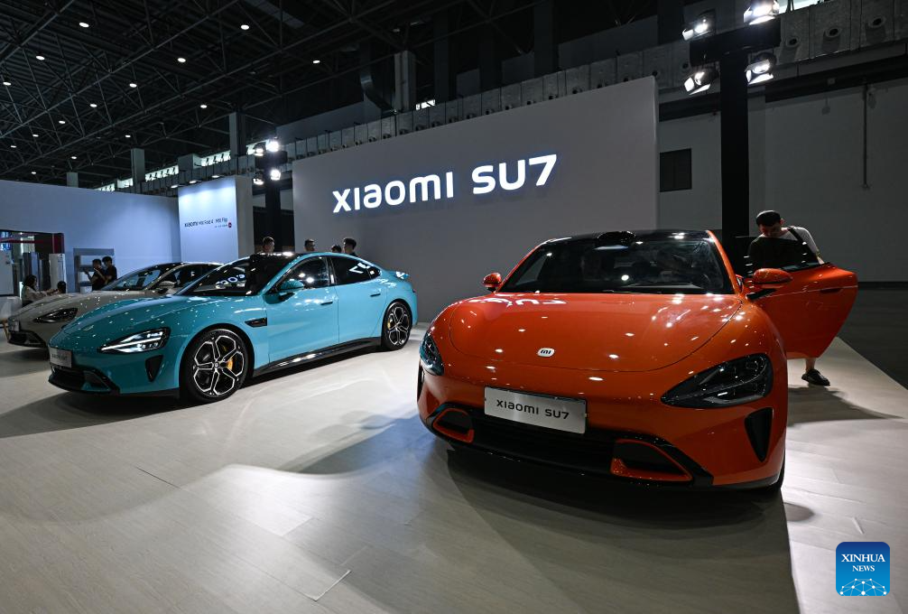 HAIKOU, 17 septiembre, 2024 (Xinhua) -- Imagen del 16 de septiembre de 2024 de automóviles Xiaomi SU7 exhibidos durante el Salón del Automóvil de Otoño de Hainan 2024 en el Centro Internacional de Conferencias y Exposiciones de Hainan, en Haikou, capital de la provincia de Hainan, en el sur de China. El evento se celebró del 13 al 16 de septiembre, con casi un centenar de fabricantes de automóviles mostrando sus productos en un área de exposición de más de 50.000 metros cuadrados. Alrededor del 70 por ciento de los automóviles exhibidos eran vehículos de nueva energía. (Xinhua/Pu Xiaoxu)