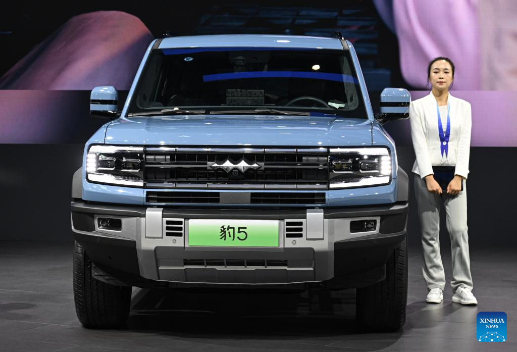 HAIKOU, 17 septiembre, 2024 (Xinhua) -- Imagen del 16 de septiembre de 2024 de un automóvil Fangchengbao Bao 5 visto en el Salón del Automóvil de Otoño de Hainan 2024 en el Centro Internacional de Conferencias y Exposiciones de Hainan, en Haikou, capital de la provincia de Hainan, en el sur de China. El evento se celebró del 13 al 16 de septiembre, con casi un centenar de fabricantes de automóviles mostrando sus productos en un área de exposición de más de 50.000 metros cuadrados. Alrededor del 70 por ciento de los automóviles exhibidos eran vehículos de nueva energía. (Xinhua/Pu Xiaoxu)