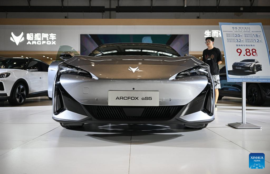 HAIKOU, 17 septiembre, 2024 (Xinhua) -- Imagen del 16 de septiembre de 2024 de un automóvil Arcfox Alpha S5 visto en el Salón del Automóvil de Otoño de Hainan 2024 en el Centro Internacional de Conferencias y Exposiciones de Hainan, en Haikou, capital de la provincia de Hainan, en el sur de China. El evento se celebró del 13 al 16 de septiembre, con casi un centenar de fabricantes de automóviles mostrando sus productos en un área de exposición de más de 50.000 metros cuadrados. Alrededor del 70 por ciento de los automóviles exhibidos eran vehículos de nueva energía. (Xinhua/Pu Xiaoxu)