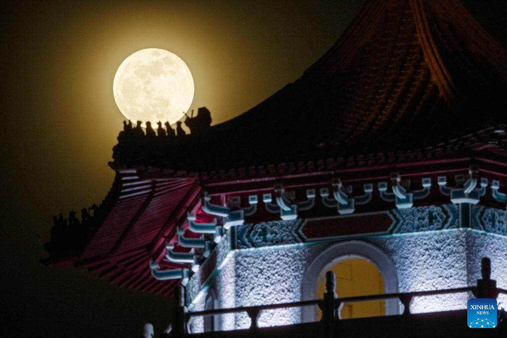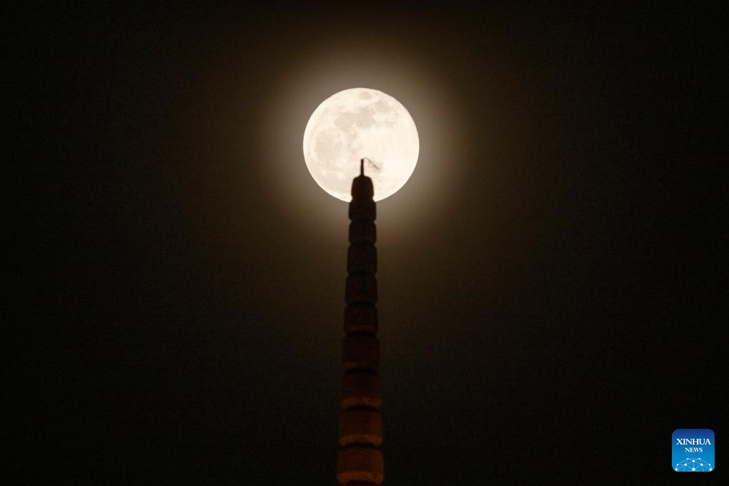 SINGAPUR, 18 septiembre, 2024 (Xinhua) -- Una superluna se eleva sobre la Pagoda de las Nubes en los Jardines del Lago Jurong, en Singapur, el 18 de septiembre de 2024. (Xinhua/Then Chih Wey)