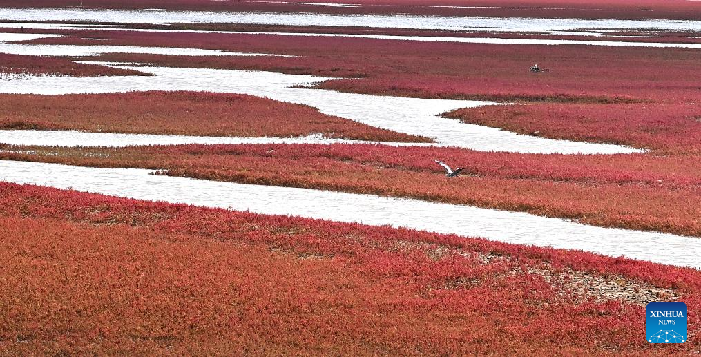 SHENYANG, 18 septiembre, 2024 (Xinhua) -- Imagen del 14 de septiembre de 2024 de un pájaro volando sobre el área escénica de la Playa Roja, en Linghai, ciudad de Jinzhou, en la provincia de Liaoning, en el noreste de China. La Playa Roja es famosa por sus paisajes mostrando la planta roja Suaeda salsa. (Xinhua/Zhou Hua)