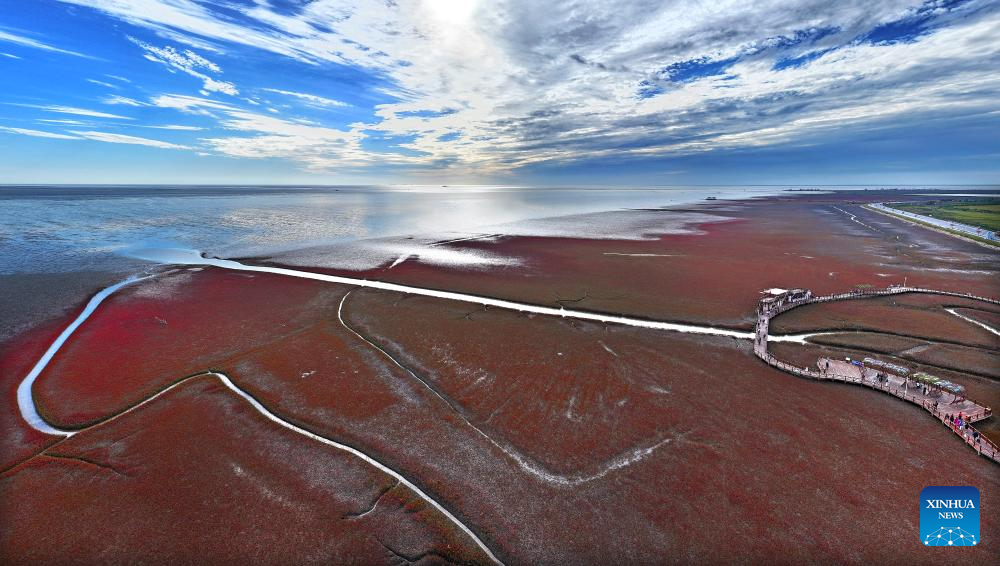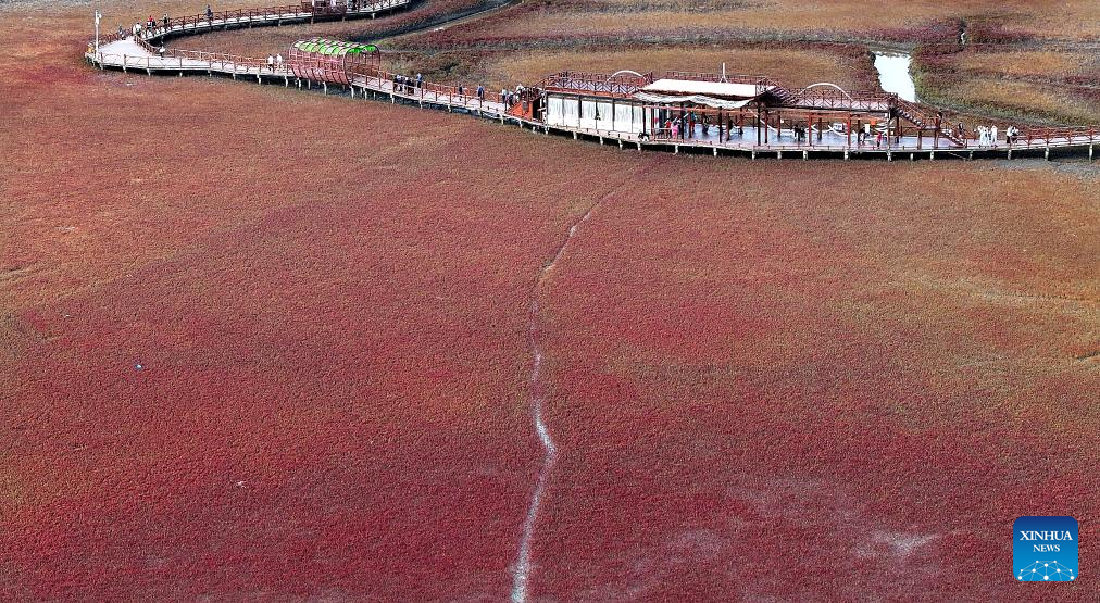 SHENYANG, 18 septiembre, 2024 (Xinhua) -- Imagen del 14 de septiembre de 2024 de la Suaeda salsa creciendo en la Playa Roja, en Linghai, ciudad de Jinzhou, en la provincia de Liaoning, en el noreste de China. La Playa Roja es famosa por sus paisajes mostrando la planta roja Suaeda salsa. (Xinhua/Qian Yi)
