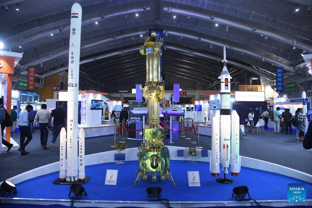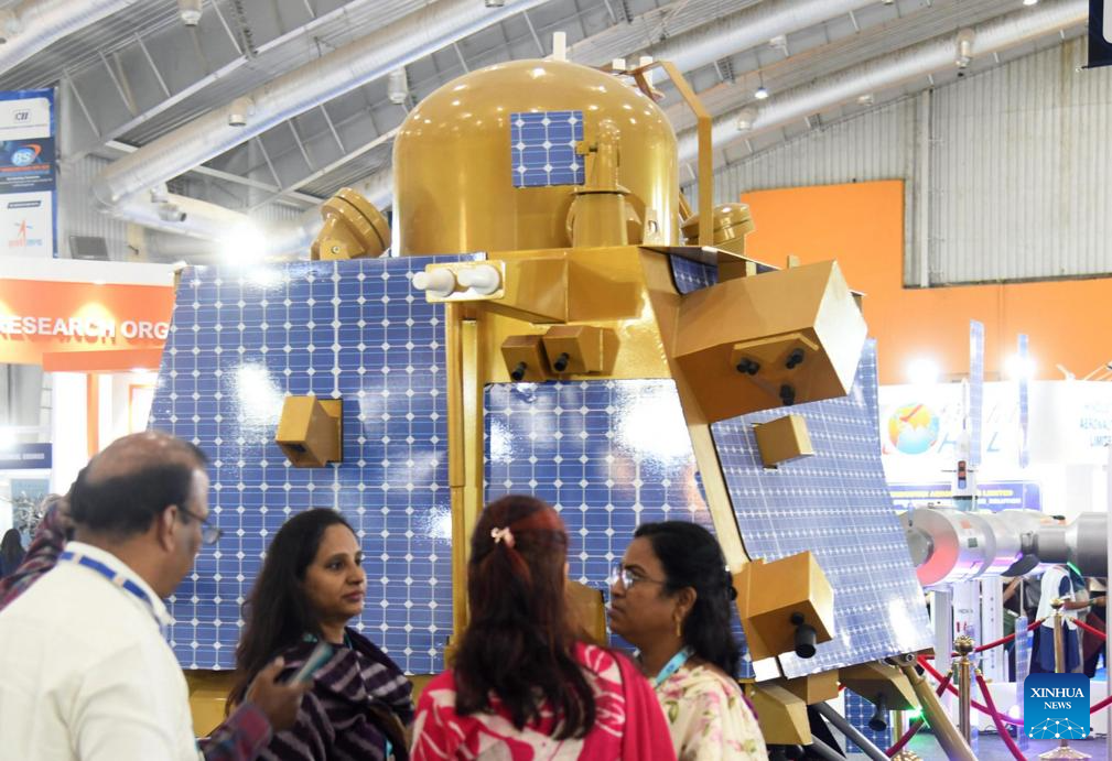 BENGALURU, 18 septiembre, 2024 (Xinhua) -- Personas asisten a la Exposición Espacial de Bengaluru 2024, en Bengaluru, India, el 18 de septiembre de 2024. La exposición mostró tecnologías y servicios relacionados con el lanzamiento de cohetes, la fabricación de satélites, la teledetección, los servicios de estaciones terrestres, la energía solar espacial, etc. (Xinhua/Str)