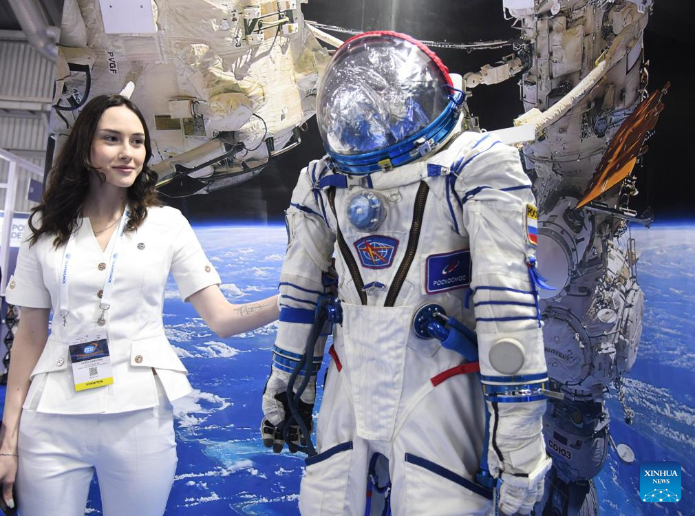 BENGALURU, 18 septiembre, 2024 (Xinhua) -- Una expositora permanece junto a un traje espacial en la Exposición Espacial de Bengaluru 2024, en Bengaluru, India, el 18 de septiembre de 2024. La exposición mostró tecnologías y servicios relacionados con el lanzamiento de cohetes, la fabricación de satélites, la teledetección, los servicios de estaciones terrestres, la energía solar espacial, etc. (Xinhua/Str)