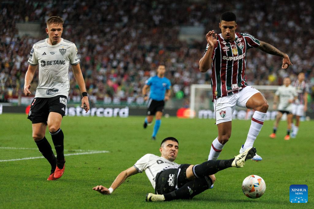 RIO DE JANEIRO, 19 septiembre, 2024 (Xinhua) -- Imagen del 18 de septiembre de 2024 del jugador Kaua Elias (d), de Fluminense de Brasil, disputando el balón con Rodrigo Battaglia (c), de Atlético Mineiro de Brasil durante el partido de ida correspondiente a los cuartos de final de la Copa Conmebol Libertadores, celebrado en el Estadio Maracaná, en Río de Janeiro, Brasil. (Xinhua/Claudia Martini)