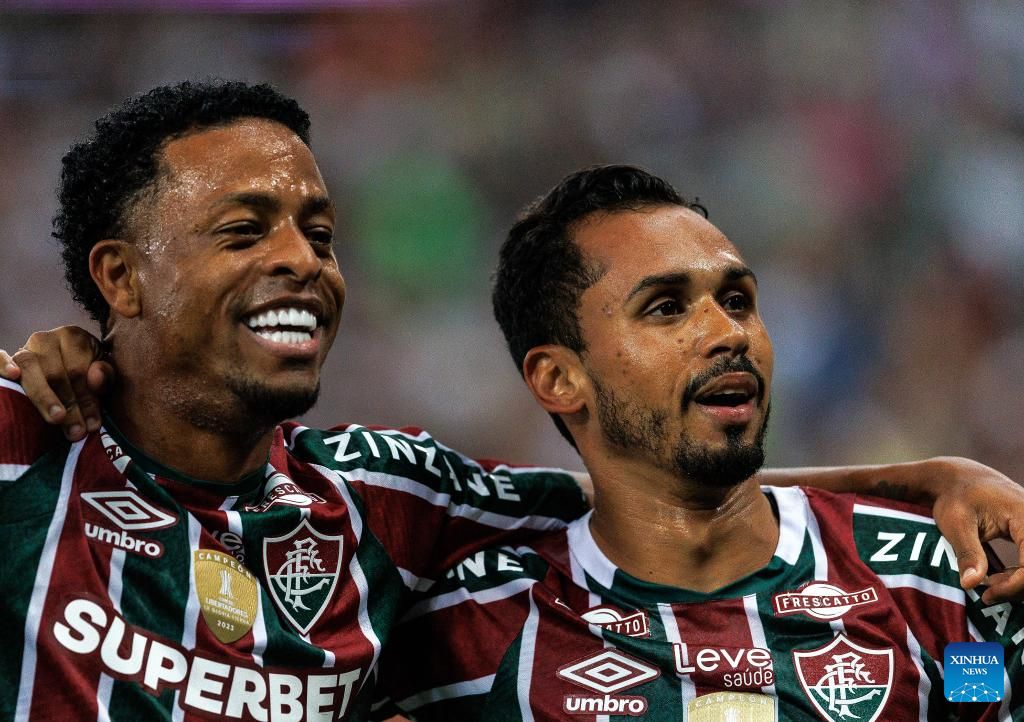 RIO DE JANEIRO, 19 septiembre, 2024 (Xinhua) -- Imagen del 18 de septiembre de 2024 del jugador Lima (d), de Fluminense de Brasil, festejando su anotación junto a su compañero Keno (i) durante el partido de ida correspondiente a los cuartos de final de la Copa Conmebol Libertadores, ante Atlético Mineiro de Brasil, celebrado en el Estadio Maracaná, en Río de Janeiro, Brasil. (Xinhua/Claudia Martini)