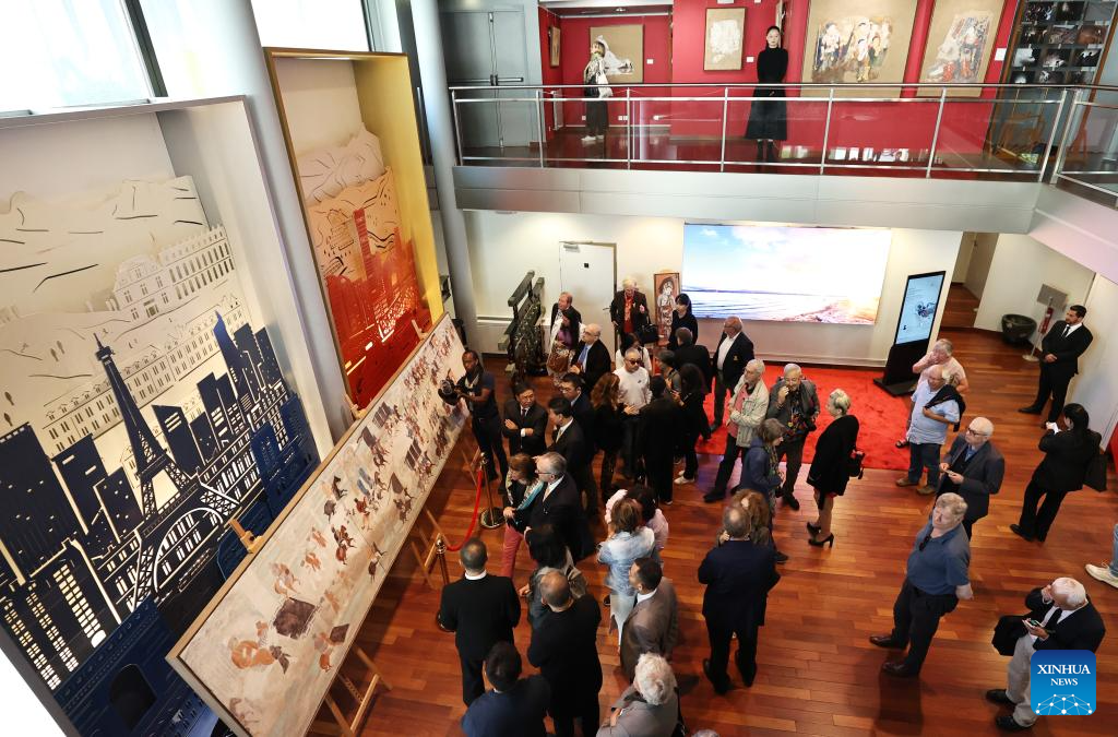 PARIS, 19 septiembre, 2024 (Xinhua) -- Imagen del 18 de septiembre de 2024 de invitados visitando la Ruta de la Seda Danqing, una exhibición de copias de las pinturas murales de templos rupestres a lo largo de la antigua Ruta de la Seda en el Centro Cultural de China, en París, Francia. La exhibición se llevará a cabo hasta el 24 de septiembre de 2024. (Xinhua/Gao Jing)