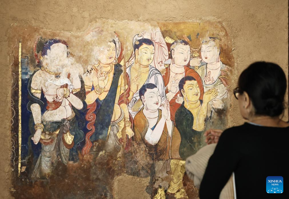 PARIS, 19 septiembre, 2024 (Xinhua) -- Imagen del 18 de septiembre de 2024 de una mujer visitando la Ruta de la Seda Danqing, una exhibición de copias de las pinturas murales de templos rupestres a lo largo de la antigua Ruta de la Seda en el Centro Cultural de China, en París, Francia. La exhibición se llevará a cabo hasta el 24 de septiembre de 2024. (Xinhua/Gao Jing)