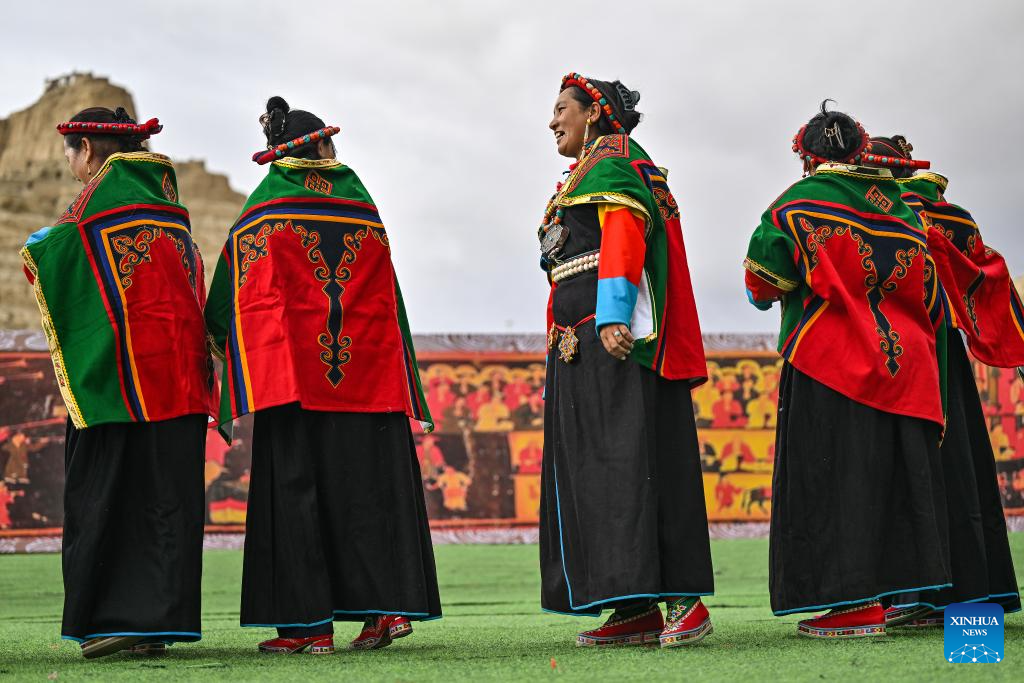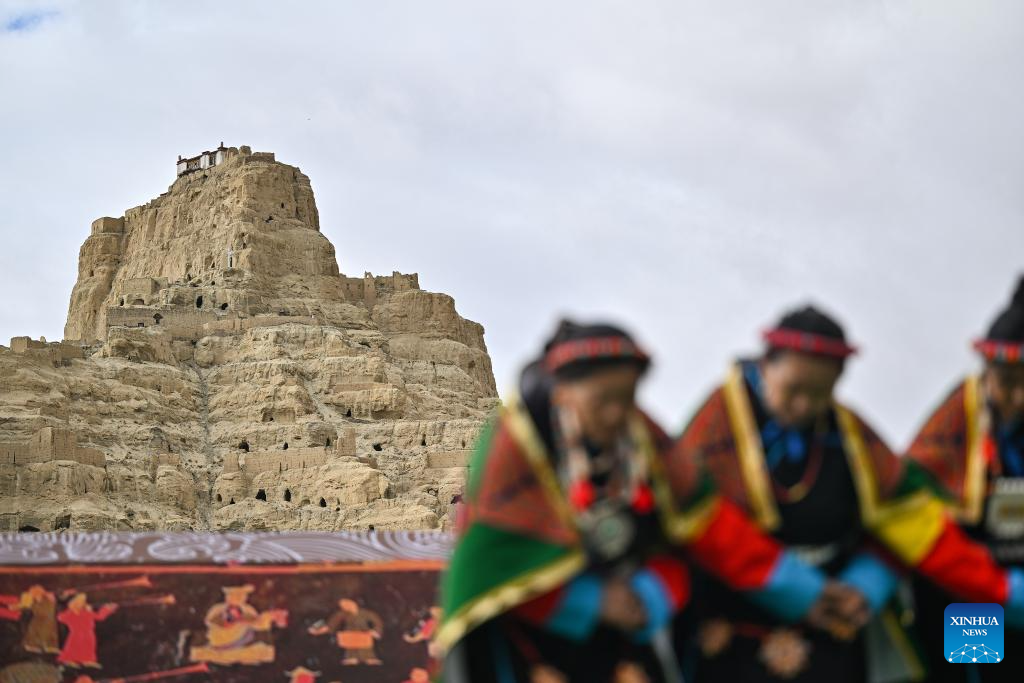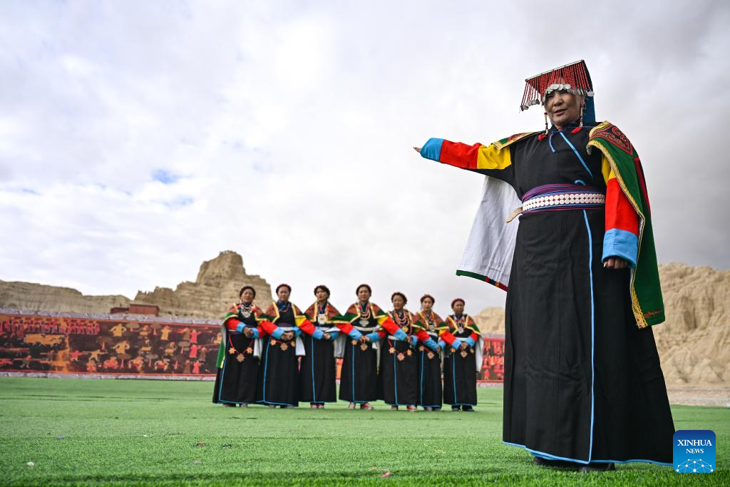 LHASA, 18 septiembre, 2024 (Xinhua) -- Imagen del 11 de septiembre de 2024 de una heredera del patrimonio cultural inmaterial (d) de la Danza Xuan presentando la danza cerca de las ruinas del Reino de Guge, en el distrito de Zanda de la prefectura de Ngari, en la región autónoma de Xizang, en el suroeste de China. La danza es una herencia cultural tibetana del antiguo Reino de Guge que mezcla el habla, el canto y la danza. Fue inscrita en la lista del patrimonio cultural inmaterial nacional en 2008. (Xinhua/Sun Ruibo)
