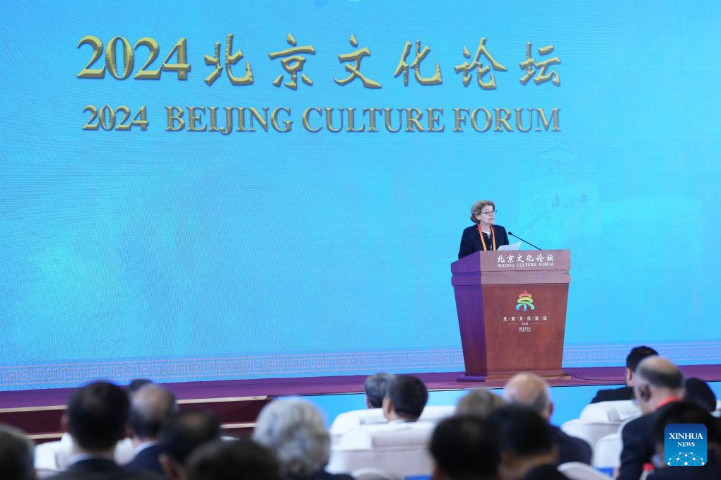 BEIJING, 19 septiembre, 2024 (Xinhua) -- Irina Bokova, ex directora general de la UNESCO, habla en la ceremonia de inauguración del Foro Cultural de Beijing 2024, en Beijing, capital de China, el 19 de septiembre de 2024. El Foro Cultural de Beijing 2024, con el tema de "Fortalecer los Intercambios Culturales para el Progreso Común", se inauguró el jueves en Beijing. (Xinhua/Ju Huanzong)