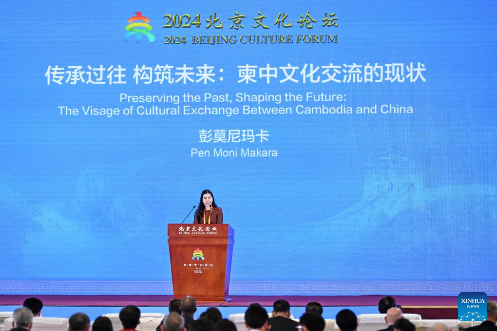BEIJING, 19 septiembre, 2024 (Xinhua) -- Pen Moni Makara, secretaria de Estado del Ministerio de Cultura y Bellas Artes de Camboya, pronuncia un discurso en el foro principal del Foro Cultural de Beijing 2024, en Beijing, capital de China, el 19 de septiembre de 2024. El Foro Cultural de Beijing 2024, con el tema de "Fortalecer los Intercambios Culturales para el Progreso Común", se inauguró el jueves en Beijing. (Xinhua/Zhang Cheng)