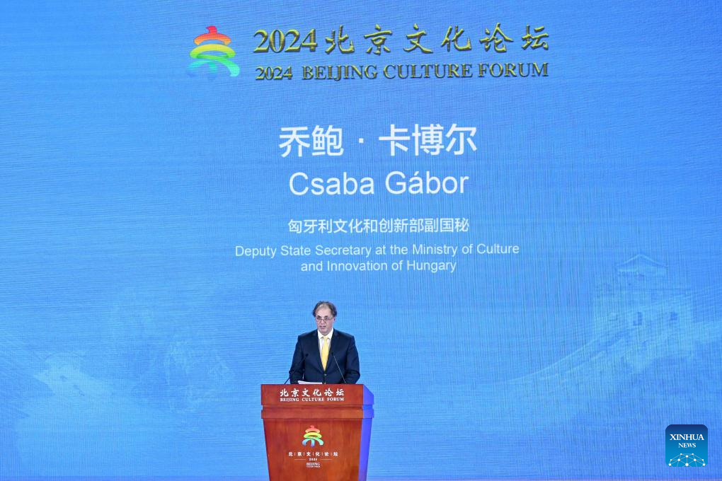 BEIJING, 19 septiembre, 2024 (Xinhua) -- Csaba Gabor, subsecretario de Estado del Ministerio de Cultura e Innovación de Hungría, pronuncia un discurso en el foro principal del Foro Cultural de Beijing 2024, en Beijing, capital de China, el 19 de septiembre de 2024. El Foro Cultural de Beijing 2024, con el tema de "Fortalecer los Intercambios Culturales para el Progreso Común", se inauguró el jueves en Beijing. (Xinhua/Zhang Cheng)