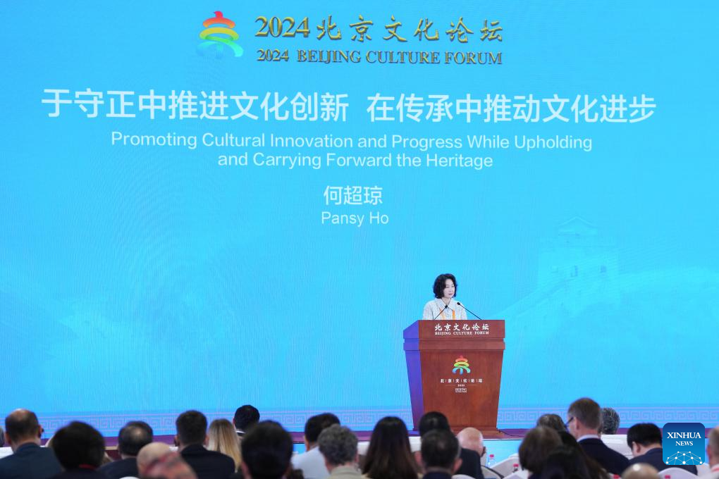 BEIJING, 19 septiembre, 2024 (Xinhua) -- Pansy Ho, vicepresidenta de la Federación de Industria y Comercio de China y presidenta de Shun Tak Holdings Limited, pronuncia un discurso en el foro principal del Foro Cultural de Beijing 2024, en Beijing, capital de China, el 19 de septiembre de 2024. El Foro Cultural de Beijing 2024, con el tema de "Fortalecer los Intercambios Culturales para el Progreso Común", se inauguró el jueves en Beijing. (Xinhua/Ju Huanzong)