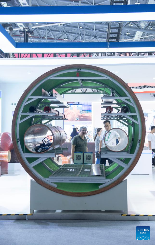 HEFEI, 20 septiembre, 2024 (Xinhua) -- Visitantes aprenden sobre un corredor de tuberías sinuosas de bambú en la Convención Mundial de Manufactura 2024, en Hefei, en la provincia de Anhui, en el este de China, el 20 de septiembre de 2024. La Convención Mundial de Manufactura 2024, inaugurada el viernes en Hefei, capital de la provincia oriental china de Anhui, destaca los más recientes productos y las innovaciones en el sector manufacturero. Con el tema "Fabricación inteligente para un futuro mejor", el evento de cuatro días cuenta con un área total de exhibición de 20.000 metros cuadrados e incluye exposiciones, foros y seminarios. (Xinhua/Fu Tian)