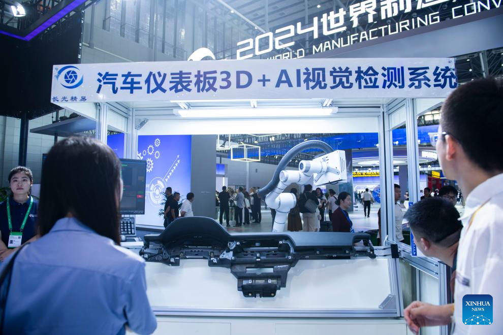 HEFEI, 20 septiembre, 2024 (Xinhua) -- Visitantes aprenden sobre un sistema de detección visual de tablero de instrumentos 3D+IA en la Convención Mundial de Manufactura 2024, en Hefei, en la provincia de Anhui, en el este de China, el 20 de septiembre de 2024. La Convención Mundial de Manufactura 2024, inaugurada el viernes en Hefei, capital de la provincia oriental china de Anhui, destaca los más recientes productos y las innovaciones en el sector manufacturero. Con el tema "Fabricación inteligente para un futuro mejor", el evento de cuatro días cuenta con un área total de exhibición de 20.000 metros cuadrados e incluye exposiciones, foros y seminarios. (Xinhua/Fu Tian)