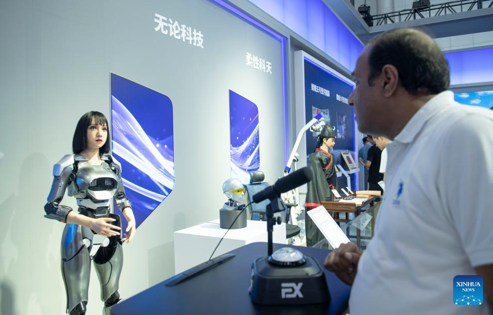 HEFEI, 20 septiembre, 2024 (Xinhua) -- Un visitante interactúa con un robot humanoide biónico en la Convención Mundial de Manufactura 2024, en Hefei, en la provincia de Anhui, en el este de China, el 20 de septiembre de 2024. La Convención Mundial de Manufactura 2024, inaugurada el viernes en Hefei, capital de la provincia oriental china de Anhui, destaca los más recientes productos y las innovaciones en el sector manufacturero. Con el tema "Fabricación inteligente para un futuro mejor", el evento de cuatro días cuenta con un área total de exhibición de 20.000 metros cuadrados e incluye exposiciones, foros y seminarios. (Xinhua/Fu Tian)