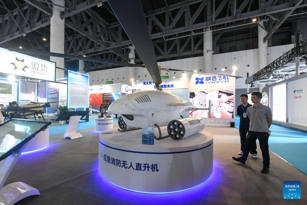 CHENGDU, 20 septiembre, 2024 (Xinhua) -- Visitantes observan un helicóptero no tripulado para operaciones de emergencia y extinción de incendios exhibido en la Exposición Internacional de Equipos y Servicios de Baja Altitud de Chengdu 2024, en Chengdu, en la provincia de Sichuan, en el suroeste de China, el 20 de septiembre de 2024. La Conferencia Internacional sobre Asociación Económica de Baja Altitud de China (Chengdu) 2024 y la Exposición Internacional de Equipos y Servicios de Baja Altitud de Chengdu 2024 se celebran aquí del 19 al 21 de septiembre, mostrando tecnologías de vanguardia y nuevos productos en la economía de baja altitud. (Xinhua/Tang Wenhao)