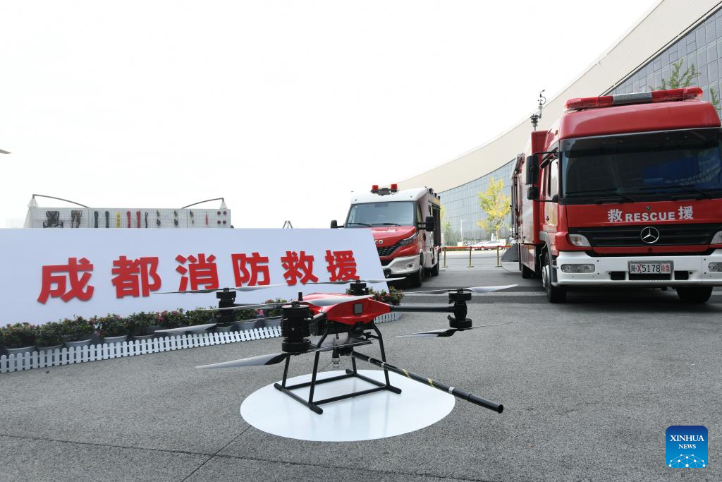 CHENGDU, 20 septiembre, 2024 (Xinhua) -- Imagen del 20 de septiembre de 2024 de equipos de extinción de incendios y rescate exhibidos en la Exposición Internacional de Equipos y Servicios de Baja Altitud de Chengdu 2024, en Chengdu, en la provincia de Sichuan, en el suroeste de China. La Conferencia Internacional sobre Asociación Económica de Baja Altitud de China (Chengdu) 2024 y la Exposición Internacional de Equipos y Servicios de Baja Altitud de Chengdu 2024 se celebran aquí del 19 al 21 de septiembre, mostrando tecnologías de vanguardia y nuevos productos en la economía de baja altitud. (Xinhua/Tang Wenhao)