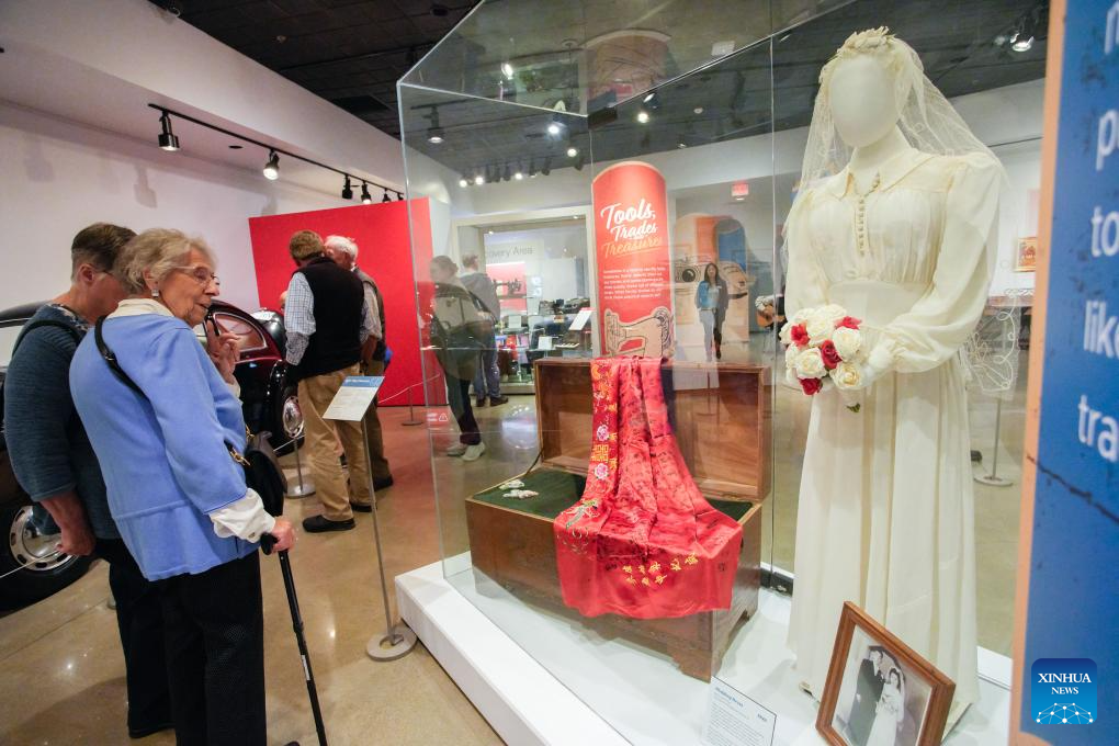 RICHMOND, 20 septiembre, 2024 (Xinhua) -- Imagen del 19 de septiembre de 2024 de visitantes observando un vestido de novia de 1946 durante una vista previa de la exposición Tesoros Familiares, en el Museo de Richmond, en Richmond, Columbia Británica, Canadá. El evento, programado para llevarse a cabo del 21 de septiembre de 2024 al 17 de agosto de 2025, brinda a las personas de diferentes grupos étnicos la oportunidad de mostrar sus tesoros y compartir sus historias con un público más amplio. Destaca las historias personales y las conexiones reveladas a través de reliquias familiares, celebrando las diversas historias dentro de la comunidad. (Xinhua/Liang Sen)
