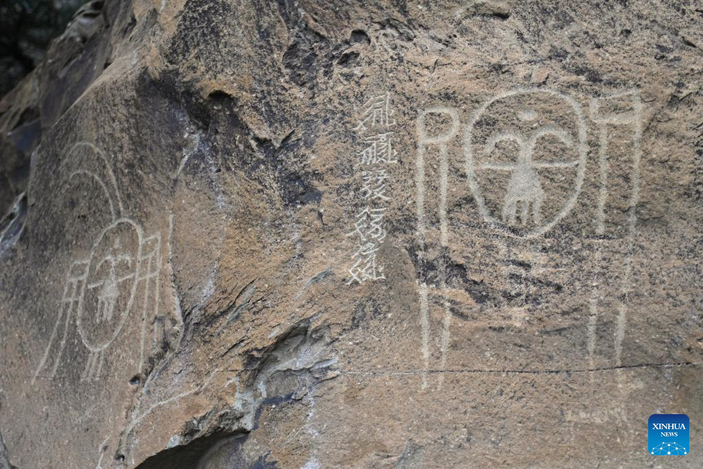 YINCHUAN, 21 septiembre, 2024 (Xinhua) -- Imagen del 20 de septiembre de 2024 de pinturas rupestres vistas en el punto escénico de pinturas rupestres de la montaña Helan, en la región autónoma de la etnia hui de Ningxia, en el noroeste de China. La montaña Helan cuenta con más de 20.000 pinturas rupestres talladas por los nómadas que alguna vez vivieron en el norte de China. Las pinturas representan el pastoreo, la caza, los ritos de sacrificio y la vida de las personas que vivieron hace 3.000 a 10.000 años. Predominan las imágenes de animales, seguidas de seres humanos, vehículos, plantas, planetas, huellas dactilares y signos abstractos. (Xinhua/Mao Zhu)