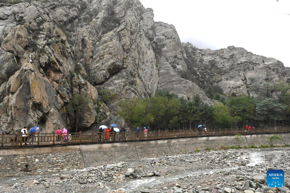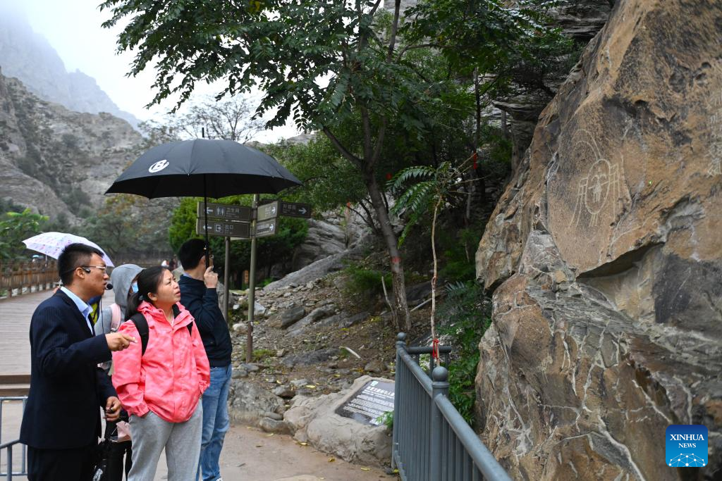 Turistas visitan el punto escénico de pinturas rupestres de la monta?a Helan en Ningxia