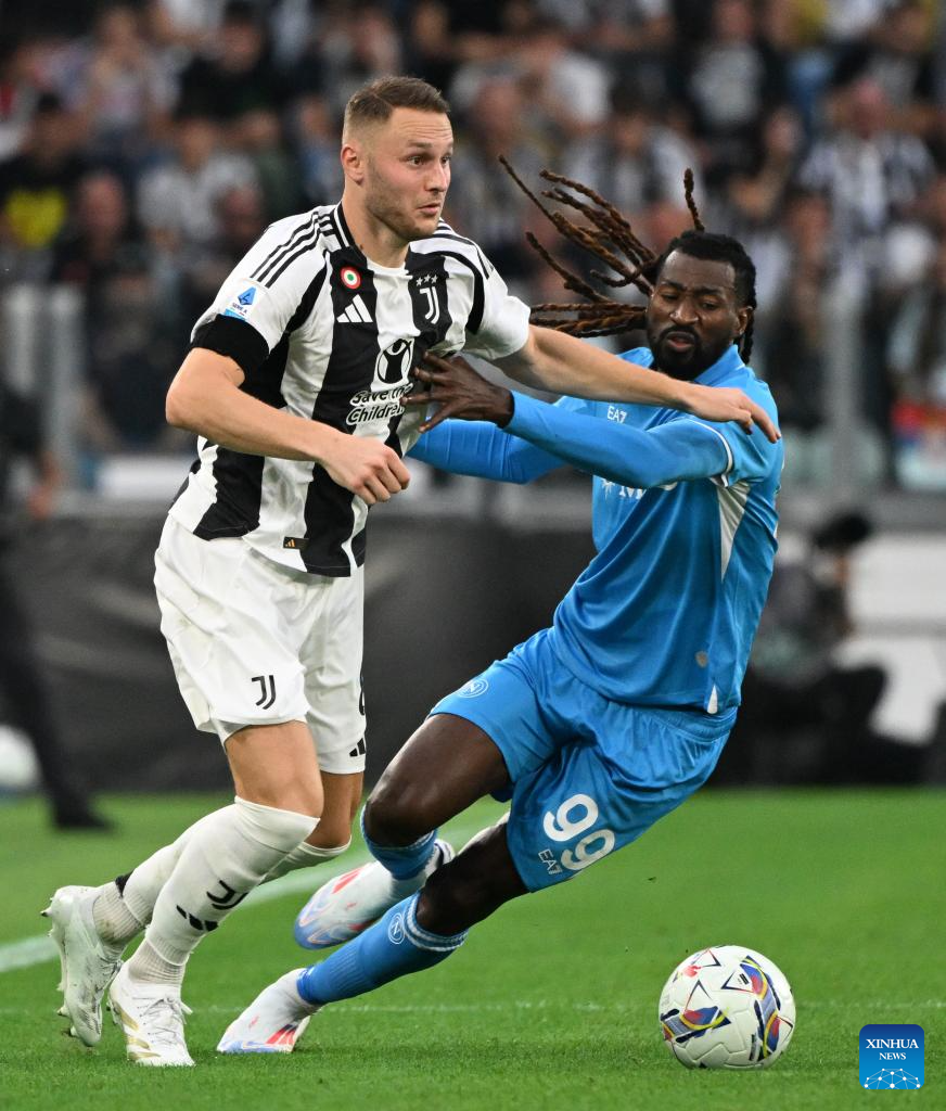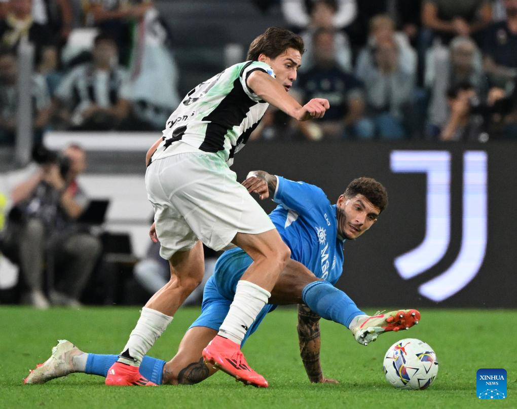 TURÍN, 22 septiembre, 2024 (Xinhua) -- Imagen del 21 de septiembre de 2024 de Kenan Yildiz (i), de Juventus, disputando el balón con Giovanni Di Lorenzo, de Nápoles, durante un partido correspondiente a la Serie A, entre Juventus y Nápoles, en Turín, Italia. (Xinhua/Alberto Lingria)
