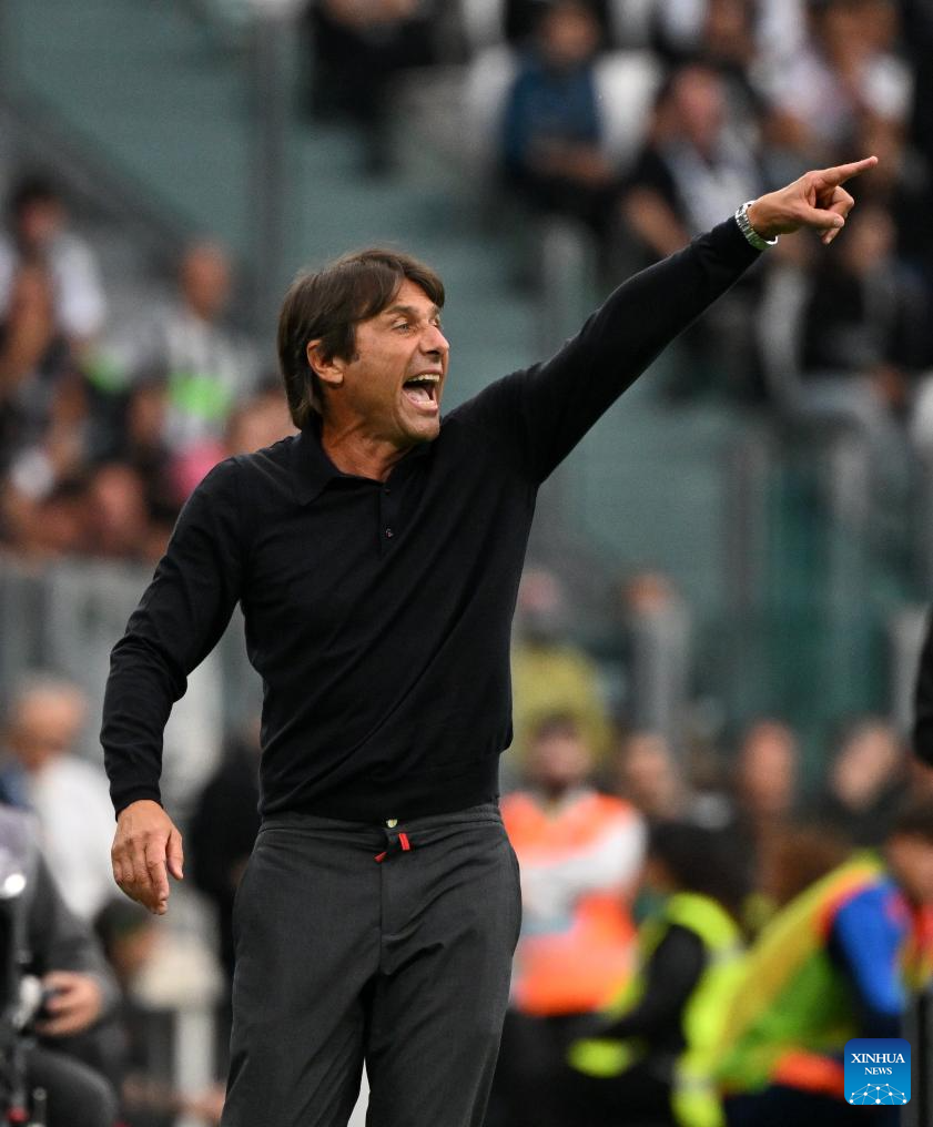TURÍN, 22 septiembre, 2024 (Xinhua) -- Imagen del 21 de septiembre de 2024 del director técnico Antonio Conte, de Nápoles, gesticulando durante un partido correspondiente a la Serie A, entre Juventus y Nápoles, en Turín, Italia. (Xinhua/Alberto Lingria)