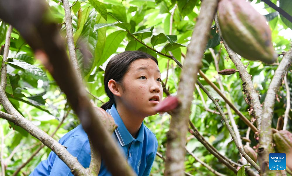 WANNING, 22 septiembre, 2024 (Xinhua) -- Una estudiante toca un fruto de cacao en el Jardín Botánico Tropical de Xinglong, en la ciudad de Wanning, en la provincia de Hainan, en el sur de China, el 22 de septiembre de 2024. La actividad de divulgación científica centrada en el cacao fue celebrada aquí el domingo por el Instituto de Investigación de Especias y Bebidas de la Academia China de Ciencias Agrícolas Tropicales. (Xinhua/Yang Guanyu)