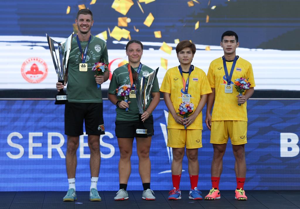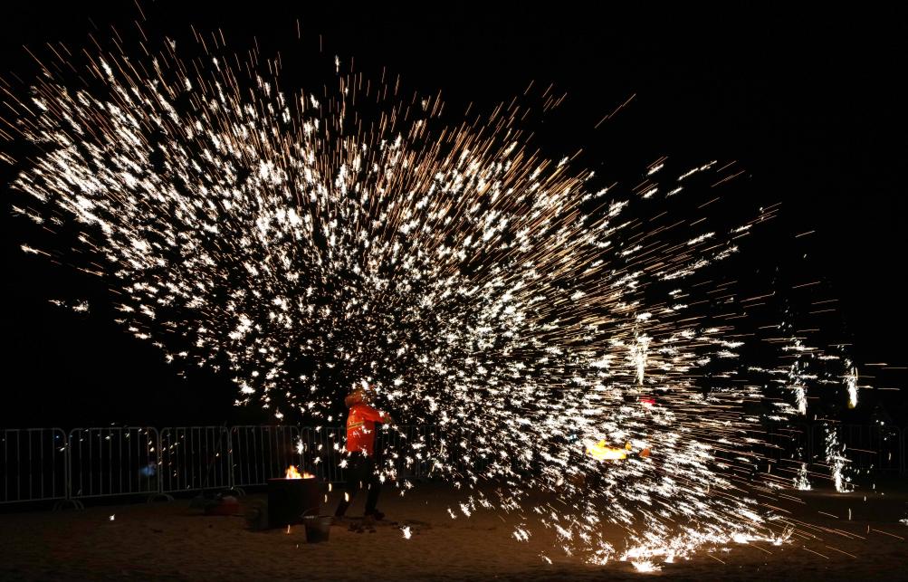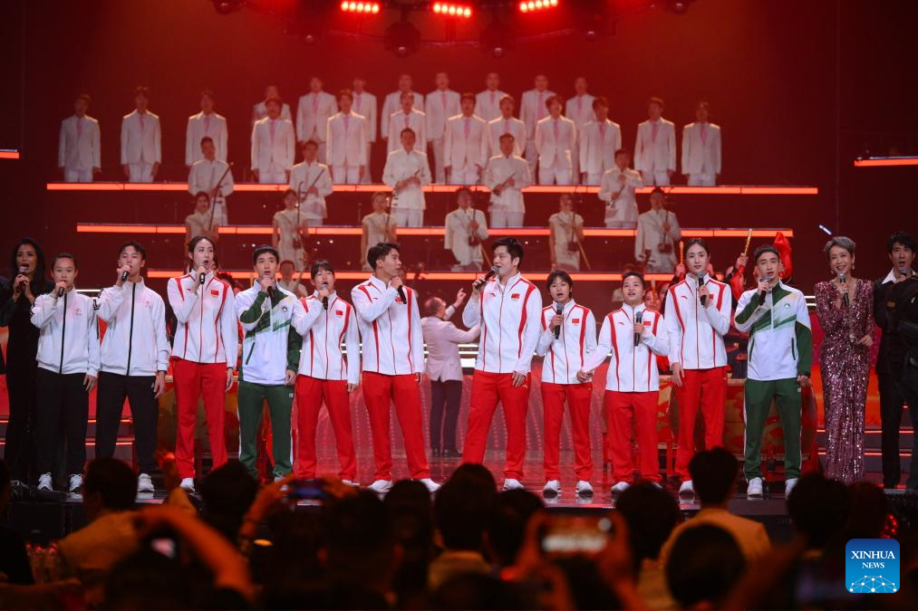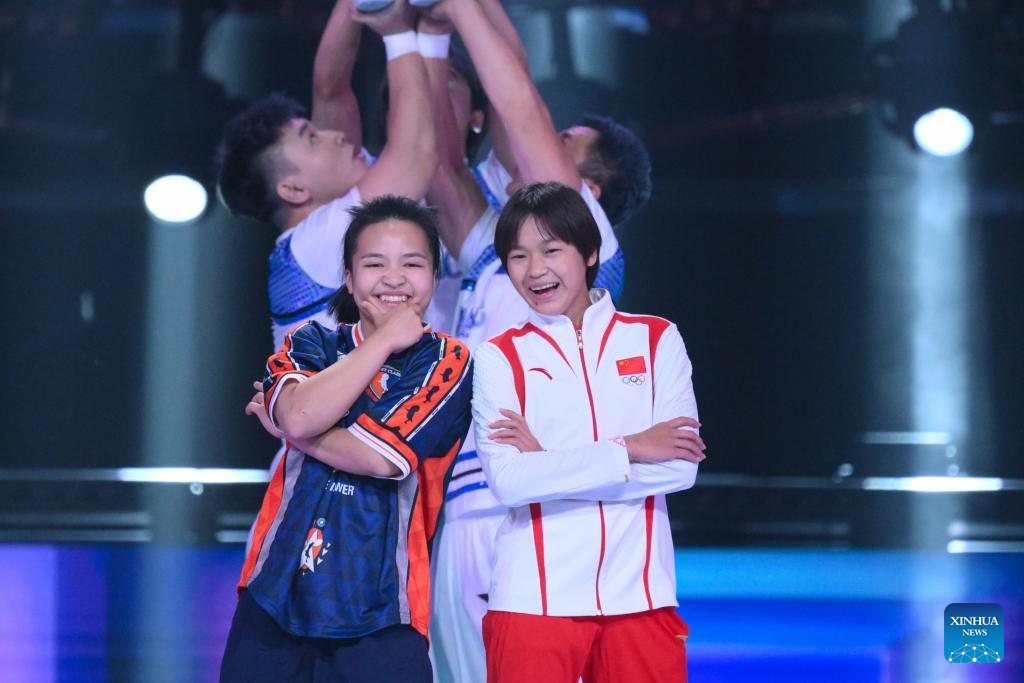 MACAO, 23 septiembre, 2024 (Xinhua) -- Imagen del 22 de septiembre de 2024 de la medallista de oro china en los Juegos Olímpicos de París 2024, Quan Hongchan (d), y la medallista de bronce, Liu Qingyi, realizando una presentación en el Concierto de Cine en el Area de la Gran Bahía 2024, en Macao, en el sur de China. El evento anual, que coincide con el Festival del Medio Otoño, transmite las tradiciones chinas y el diseño artístico de vanguardia. (Xinhua/Cheong Kam Ka)