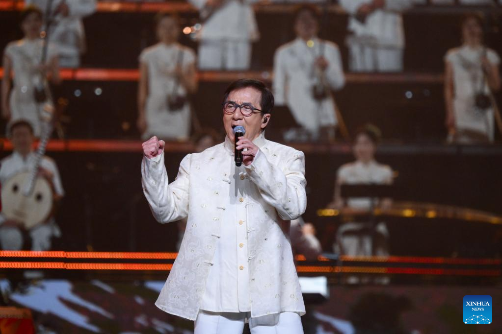 MACAO, 23 septiembre, 2024 (Xinhua) -- Imagen del 22 de septiembre de 2024 de Jackie Chan realizando una presentación durante el Concierto de Cine en el Area de la Gran Bahía 2024, en Macao, en el sur de China. El evento anual, que coincide con el Festival del Medio Otoño, transmite las tradiciones chinas y el diseño artístico de vanguardia. (Xinhua/Cheong Kam Ka)