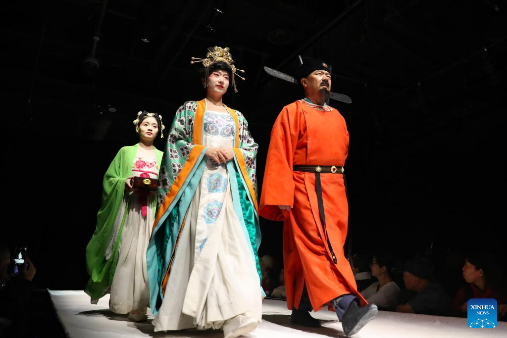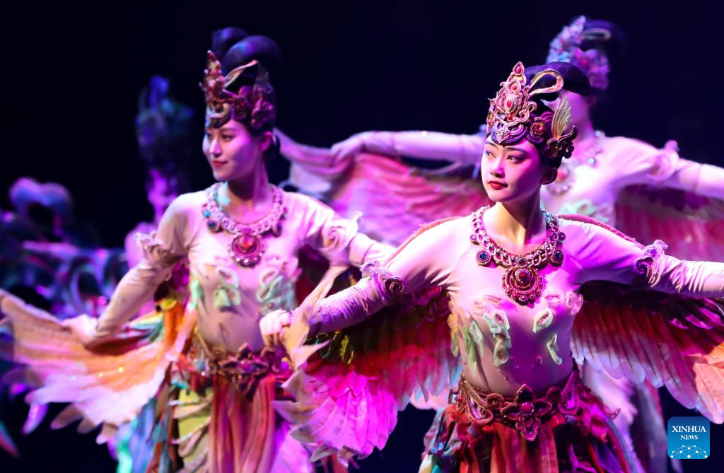 DUNHUANG, 23 septiembre, 2024 (Xinhua) -- Imagen del 20 de septiembre de 2024 de una presentación de música y danza tradicional de Dunhuang durante la VII Exposición Cultural Internacional de la Ruta de la Seda (Dunhuang), en Dunhuang, en la provincia de Gansu, en el noroeste de China. La exposición de tres días concluyó aquí el domingo. (Xinhua/Lang Bingbing)