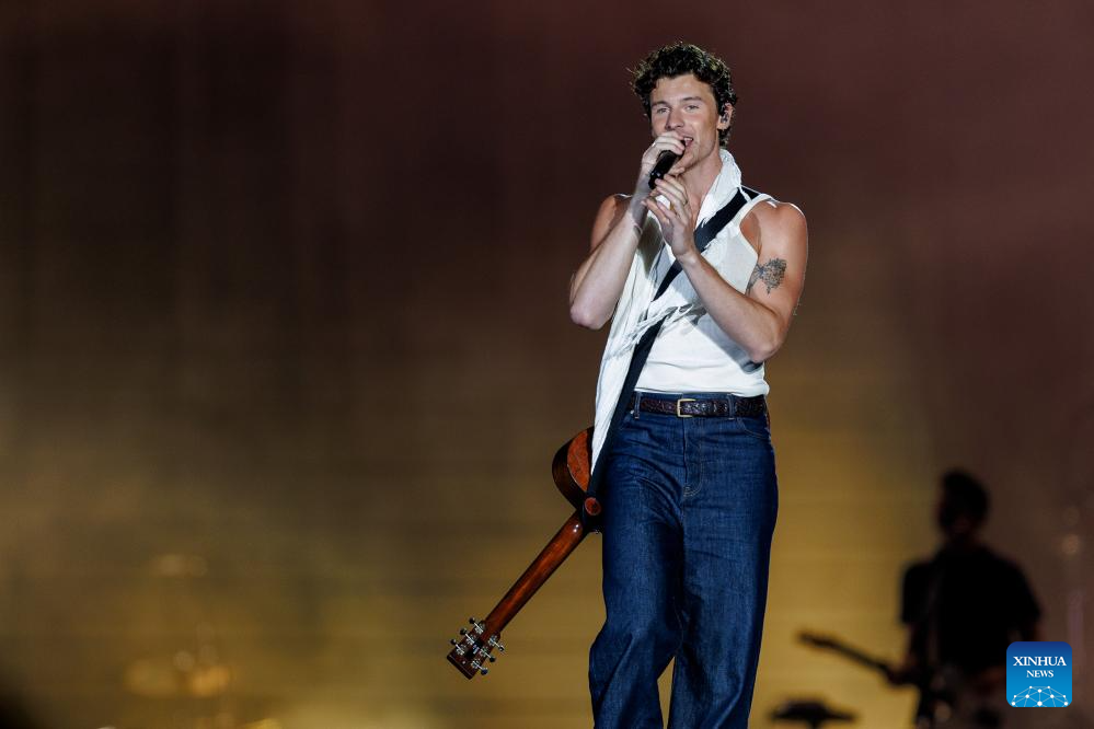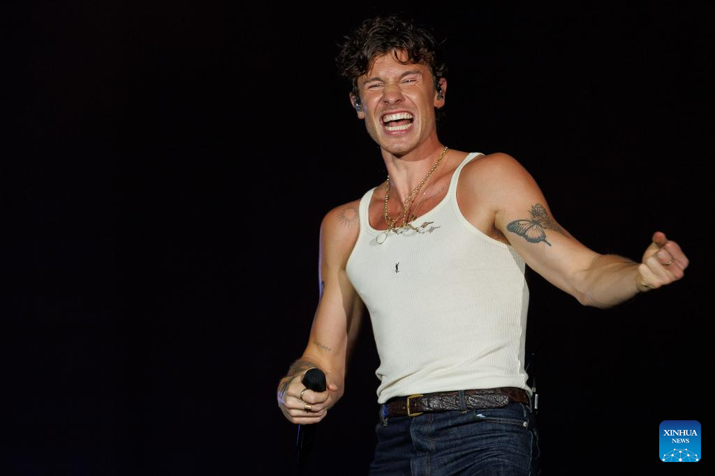 RIO DE JANEIRO, 23 septiembre, 2024 (Xinhua) -- Imagen del 22 de septiembre de 2024 del cantante Shawn Mendes realizando una presentación durante el festival de música "Rock in Rio 2024", en Río de Janeiro, Brasil. (Xinhua/Claudia Martini)