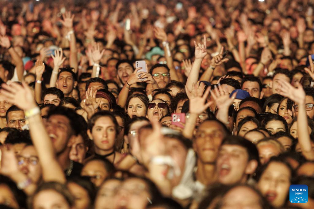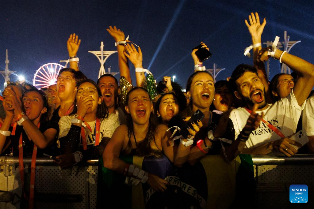 RIO DE JANEIRO, 23 septiembre, 2024 (Xinhua) -- Imagen del 22 de septiembre de 2024 de personas reaccionando durante el festival de música "Rock in Rio 2024", en Río de Janeiro, Brasil. (Xinhua/Claudia Martini)