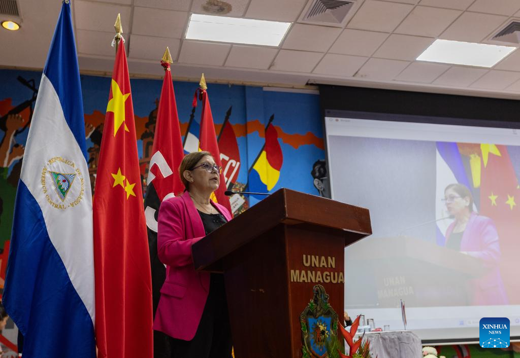 Imagen del 24 de septiembre de 2024 de la rectora de la Universidad Nacional Autónoma de Nicaragua en Managua, Ramona Rodríguez, hablando durante la presentación de la Alianza Internacional para el Desarrollo de la Educación en Chino en Centroamérica, en Managua, Nicaragua. Institutos Confucio de varios países centroamericanos presentaron el martes en Nicaragua la Alianza Internacional para el Desarrollo de la Educación en Chino en Centroamérica, una iniciativa que busca fortalecer el aprendizaje del idioma del país asiático en la región y los intercambios culturales entre ambas partes. (Xinhua/Li Mengxin)