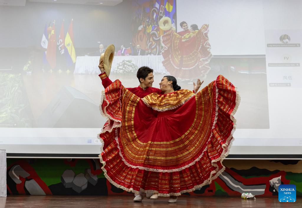Imagen del 24 de septiembre de 2024 de artistas realizando un baile típico durante la presentación de la Alianza Internacional para el Desarrollo de la Educación en Chino en Centroamérica, en Managua, Nicaragua. Institutos Confucio de varios países centroamericanos presentaron el martes en Nicaragua la Alianza Internacional para el Desarrollo de la Educación en Chino en Centroamérica, una iniciativa que busca fortalecer el aprendizaje del idioma del país asiático en la región y los intercambios culturales entre ambas partes. (Xinhua/Li Mengxin)