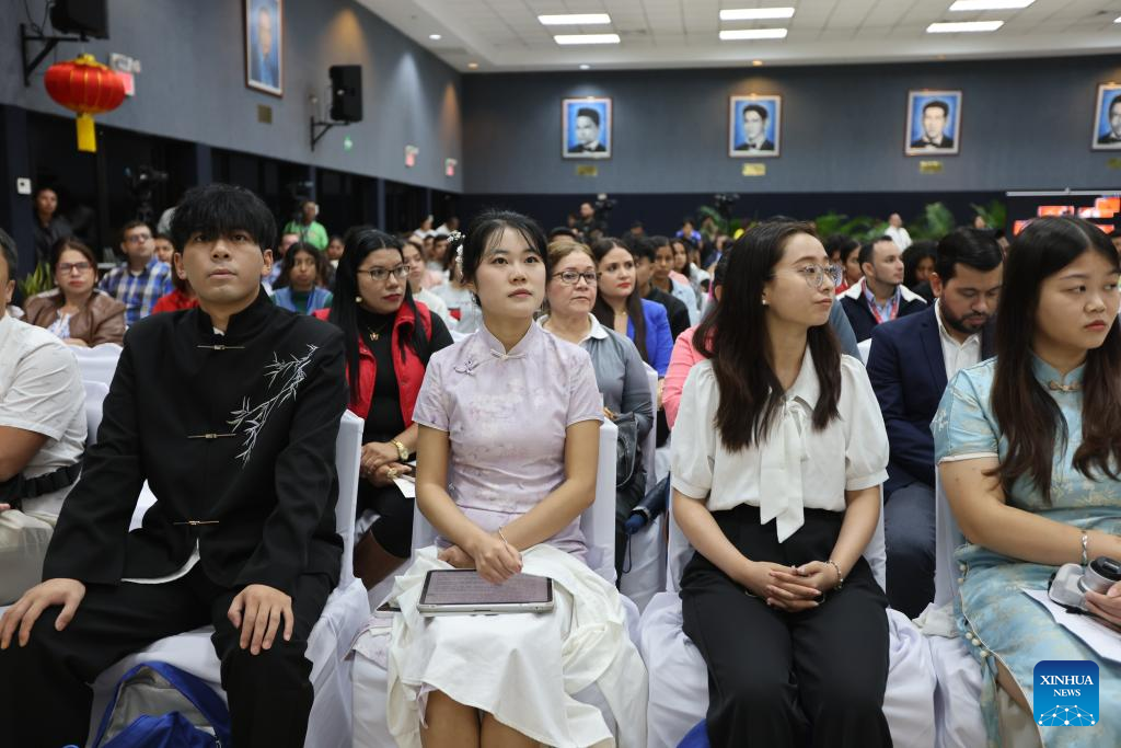 Imagen del 24 de septiembre de 2024 de la personas asistiendo a la presentación de la Alianza Internacional para el Desarrollo de la Educación en Chino en Centroamérica, en Managua, Nicaragua. Institutos Confucio de varios países centroamericanos presentaron el martes en Nicaragua la Alianza Internacional para el Desarrollo de la Educación en Chino en Centroamérica, una iniciativa que busca fortalecer el aprendizaje del idioma del país asiático en la región y los intercambios culturales entre ambas partes. (Xinhua/Li Mengxin)