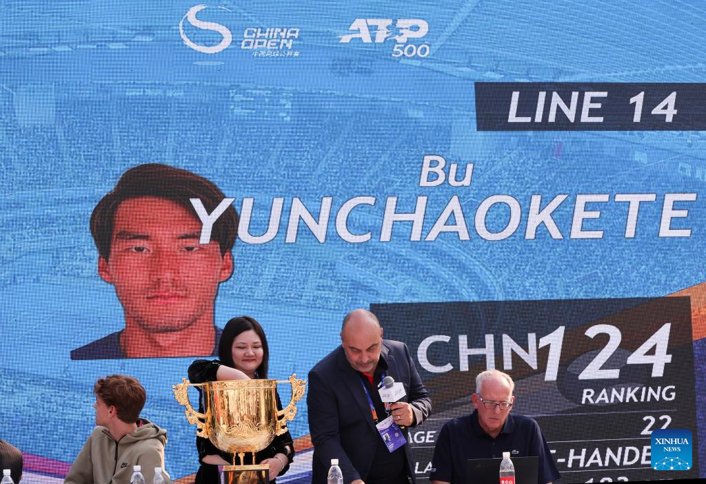 BEIJING, 24 septiembre, 2024 (Xinhua) -- El nombre del jugador, Bu Yunchaokete, de China, aparece en la pantalla durante el sorteo de individuales masculinos del torneo de tenis Abierto de China 2024, en Beijing, capital de China, el 24 de septiembre de 2024. (Xinhua/Zhang Chen)