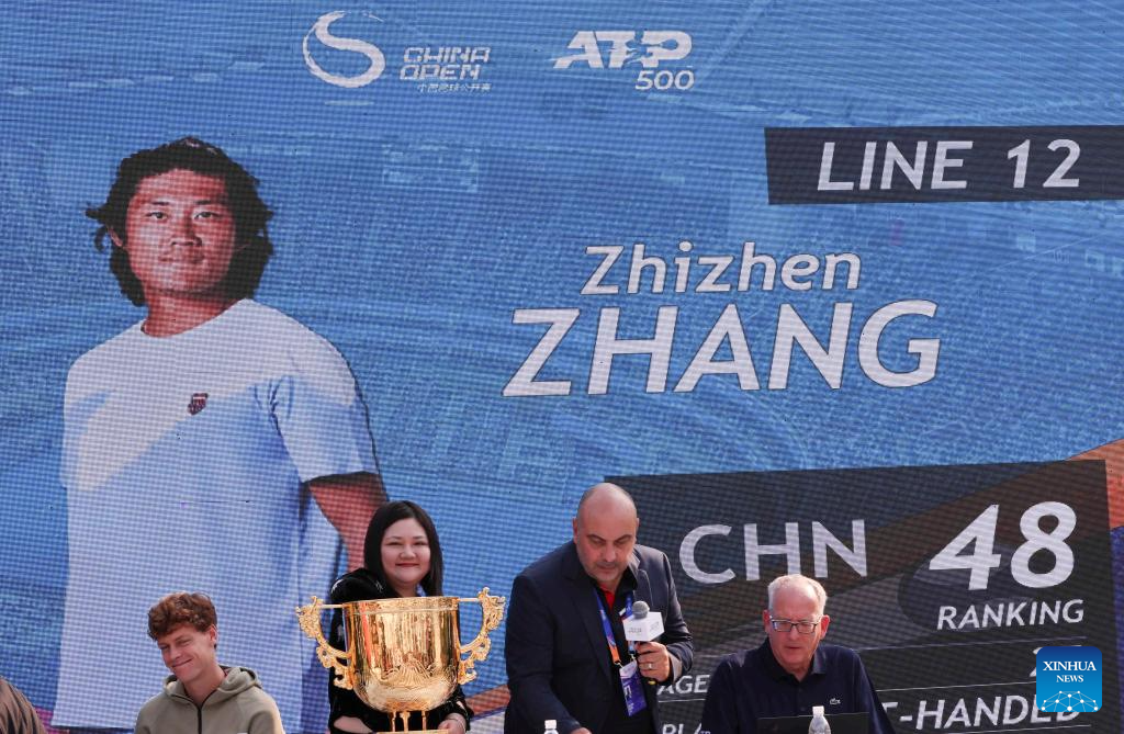 BEIJING, 24 septiembre, 2024 (Xinhua) -- El nombre del jugador, Zhang Zhizhen, de China, aparece en la pantalla durante el sorteo de individuales masculinos del torneo de tenis Abierto de China 2024, en Beijing, capital de China, el 24 de septiembre de 2024. (Xinhua/Zhang Chen)