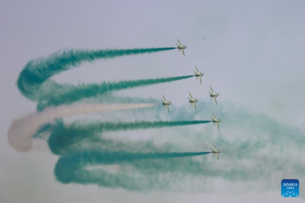 RIAD, 24 septiembre, 2024 (Xinhua) -- Imagen del 23 de septiembre de 2024 de un espectáculo aéreo llevándose a cabo en celebración del Día Nacional de Arabia Saudita, en Riad, Arabia Saudita. (Xinhua/Wang Haizhou)
