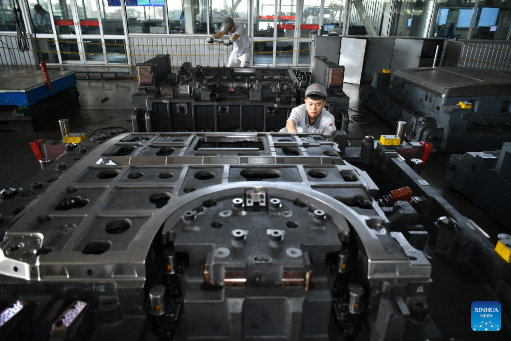 CANGZHOU, 25 septiembre, 2024 (Xinhua) -- Imagen del 24 de septiembre de 2024 de un trabajador ensamblando una pieza de un molde en una empresa de moldes, en Botou, en la provincia de Hebei, en el norte de China. Como una de las antiguas bases industriales del centro-sur de Hebei, Botou es conocida como el "origen de la industria de la fundición" del país, hogar de 322 empresas de fundición y con una producción anual de 24.7 billones de yuanes (aproximadamente 3.52 billones de dólares estadounidenses) por parte de los actores agrupados allí. En los últimos años se ha visto cómo sus procesos de fabricación se han convertido en ecológicos y respetuosos con el medio ambiente. (Xinhua/Mu Yu)
