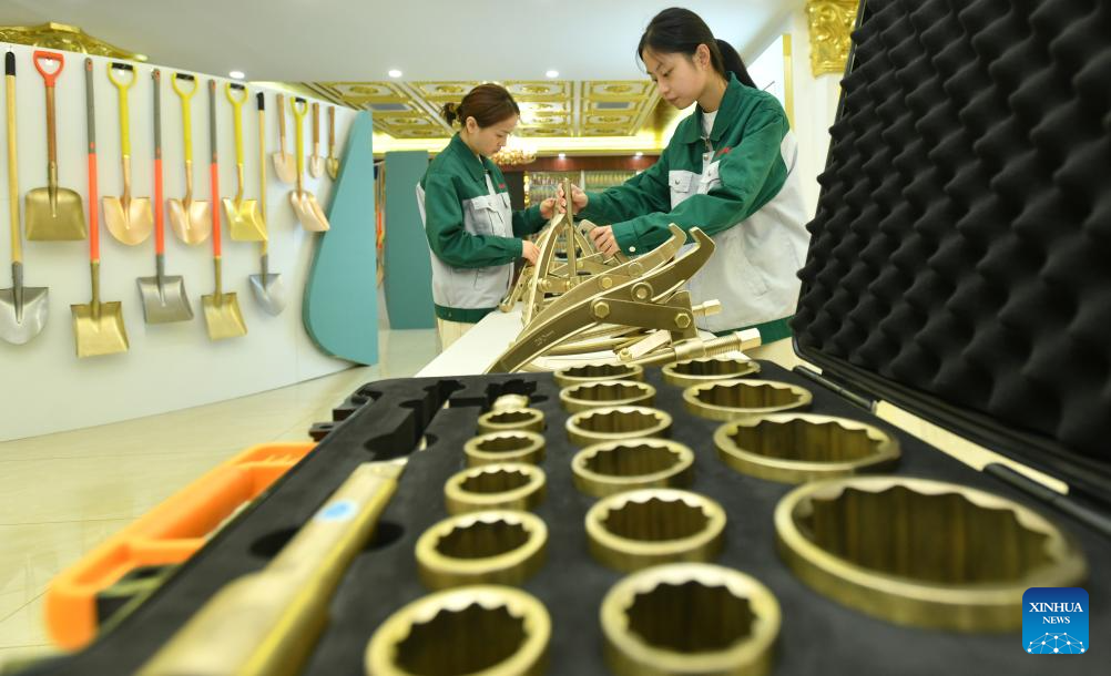 CANGZHOU, 25 septiembre, 2024 (Xinhua) -- Imagen del 24 de septiembre de 2024 de trabajadoras acomodando objetos expuestos en la sala de exposiciones de una empresa que produce herramientas de prevención de explosiones, en Botou, en la provincia de Hebei, en el norte de China. Como una de las antiguas bases industriales del centro-sur de Hebei, Botou es conocida como el "origen de la industria de la fundición" en el país, hogar de 322 empresas de fundición, y con una producción anual de 24.7 billones de yuanes (aproximadamente 3.52 billones de dólares estadounidenses) por parte de los actores agrupados allí. En los últimos años se ha visto cómo sus procesos de fabricación se han convertido en ecológicos y respetuosos con el medio ambiente. (Xinhua/Mu Yu)