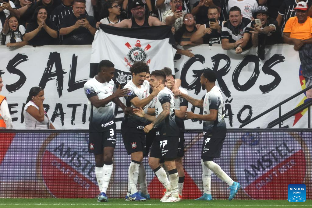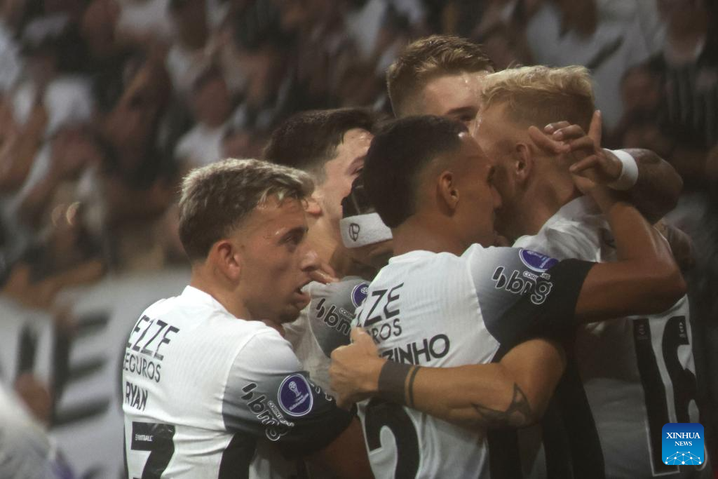 SAO PAULO, 25 septiembre, 2024 (Xinhua) -- Imagen del 24 de septiembre de 2024 de jugadores de Corinthians de Brasil festejando una anotación durante el partido correspondiente a la segunda vuelta de los cuartos de final de la Copa CONMEBOL Sudamericana ante Fortaleza de Brasil, celebrado en la Arena Corinthians, en Sao Paulo, Brasil. (Xinhua/Rahel Patrasso)