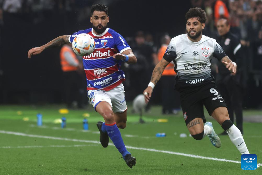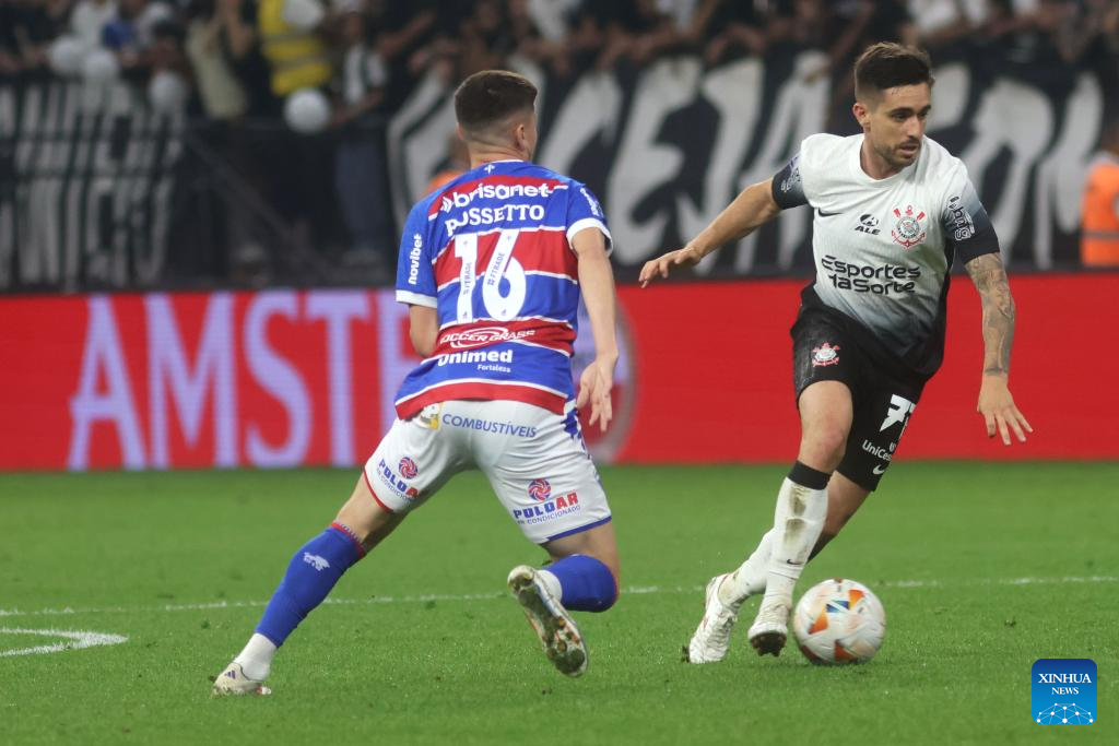 SAO PAULO, 25 septiembre, 2024 (Xinhua) -- Imagen del 24 de septiembre de 2024 del jugador Igor Coronado (d), de Corinthians de Brasil, disputando el balón con Matheus Rossetto (i), de Fortaleza de Brasil, durante el partido correspondiente a la segunda vuelta de los cuartos de final de la Copa CONMEBOL Sudamericana, celebrado en la Arena Corinthians, en Sao Paulo, Brasil. (Xinhua/Rahel Patrasso)