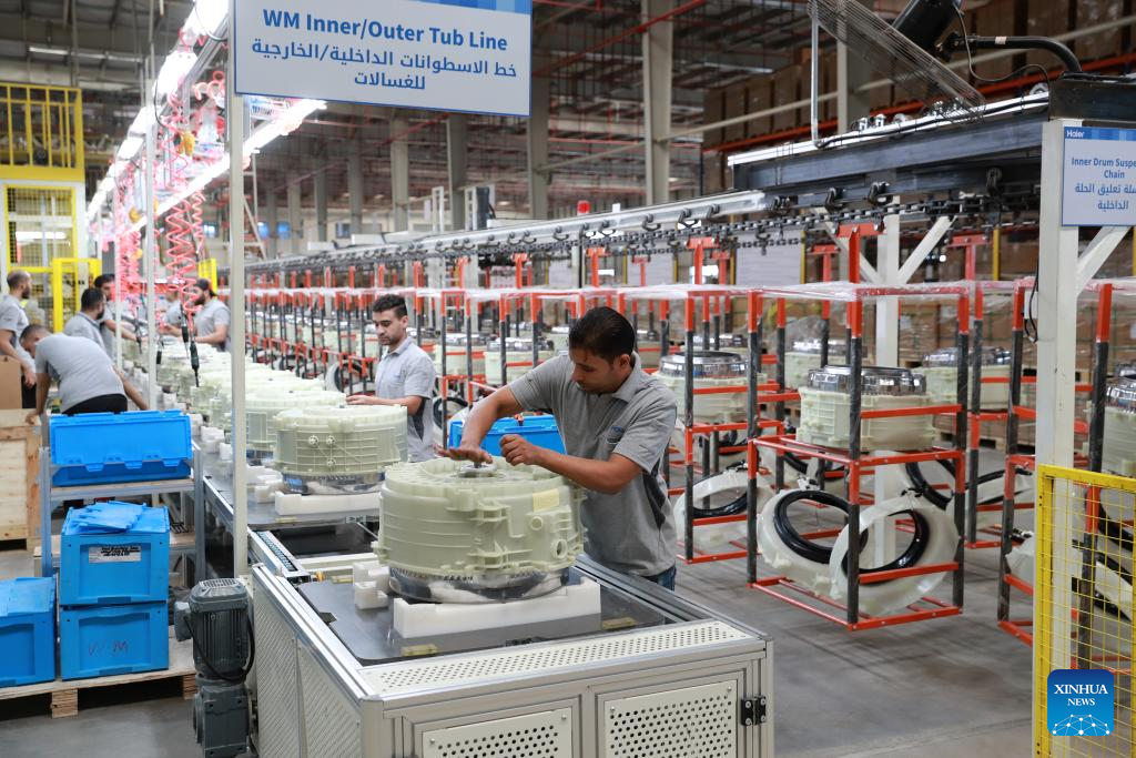 EL CAIRO, 25 septiembre, 2024 (Xinhua) -- Imagen del 23 de septiembre de 2024 de trabajadores operando en una línea de ensamblaje de lavadoras en la primera fase del Parque Ecologico Haier Egipto, en 10 de Ramadán, una ciudad al noreste de El Cairo, Egipto. El gigante chino de electrodomésticos Haier celebró el lunes una ceremonia inaugural para la segunda fase de su parque industrial en Egipto. El Parque Ecológico Haier Egipto es una inversión de Haier Smart Home Co., Ltd., una filial del grupo Haier. Una vez construido, el parque cubrirá una superficie de 200.000 metros cuadrados y tendrá una capacidad de producción anual de más de 1,5 millones de unidades de electrodomésticos. La segunda fase del proyecto, con una inversión de unos 40 millones de dólares estadounidenses, producirá principalmente refrigeradores y congeladores. (Xinhua/Sui Xiankai)