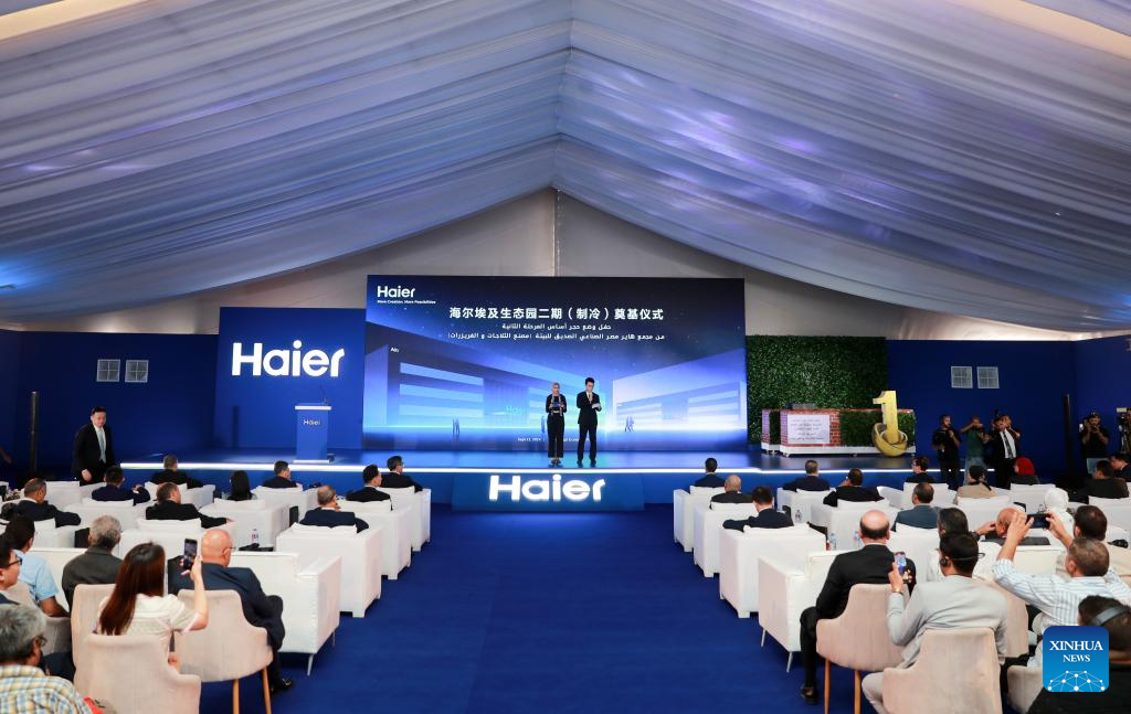 EL CAIRO, 25 septiembre, 2024 (Xinhua) -- Imagen del 23 de septiembre de 2024 de la ceremonia inaugural del Parque Ecologico Haier Egipto llevándose a cabo, en 10 de Ramadán, una ciudad al noreste de El Cairo, Egipto. El gigante chino de electrodomésticos Haier celebró el lunes una ceremonia inaugural para la segunda fase de su parque industrial en Egipto. El Parque Ecológico Haier Egipto es una inversión de Haier Smart Home Co., Ltd., una filial del grupo Haier. Una vez construido, el parque cubrirá una superficie de 200.000 metros cuadrados y tendrá una capacidad de producción anual de más de 1,5 millones de unidades de electrodomésticos. La segunda fase del proyecto, con una inversión de unos 40 millones de dólares estadounidenses, producirá principalmente refrigeradores y congeladores. (Xinhua/Sui Xiankai)
