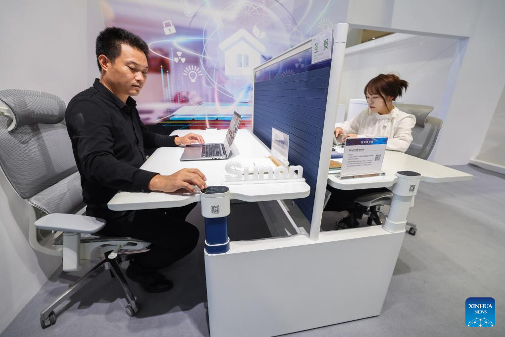 HANGZHOU, 25 septiembre, 2024 (Xinhua) -- Trabajadores presentan un escritorio de oficina inteligente en la Zona de Comercio Electrónico de la Ruta de la Seda durante la III Exposición Global de Comercio Digital, en Hangzhou, provincia de Zhejiang, en el este de China, el 25 de septiembre de 2024. La III Exposición Global de Comercio Digital, inaugurada el miércoles en Hangzhou, presenta las más recientes innovaciones tecnológicas y el desarrollo empresarial del sector de la economía digital. Con el tema "Comercio digital, acceso global", la edición de este año ha atraído a más de 1.500 empresas nacionales y extranjeras, entre las cuales, una cifra superior a 300 son compañías internacionales. Igualmente, el número de compradores inscritos para el evento sobrepasa los 30.000 y más de 6.000 de ellos proceden de regiones y países extranjeros. (Xinhua/Xu Yu)